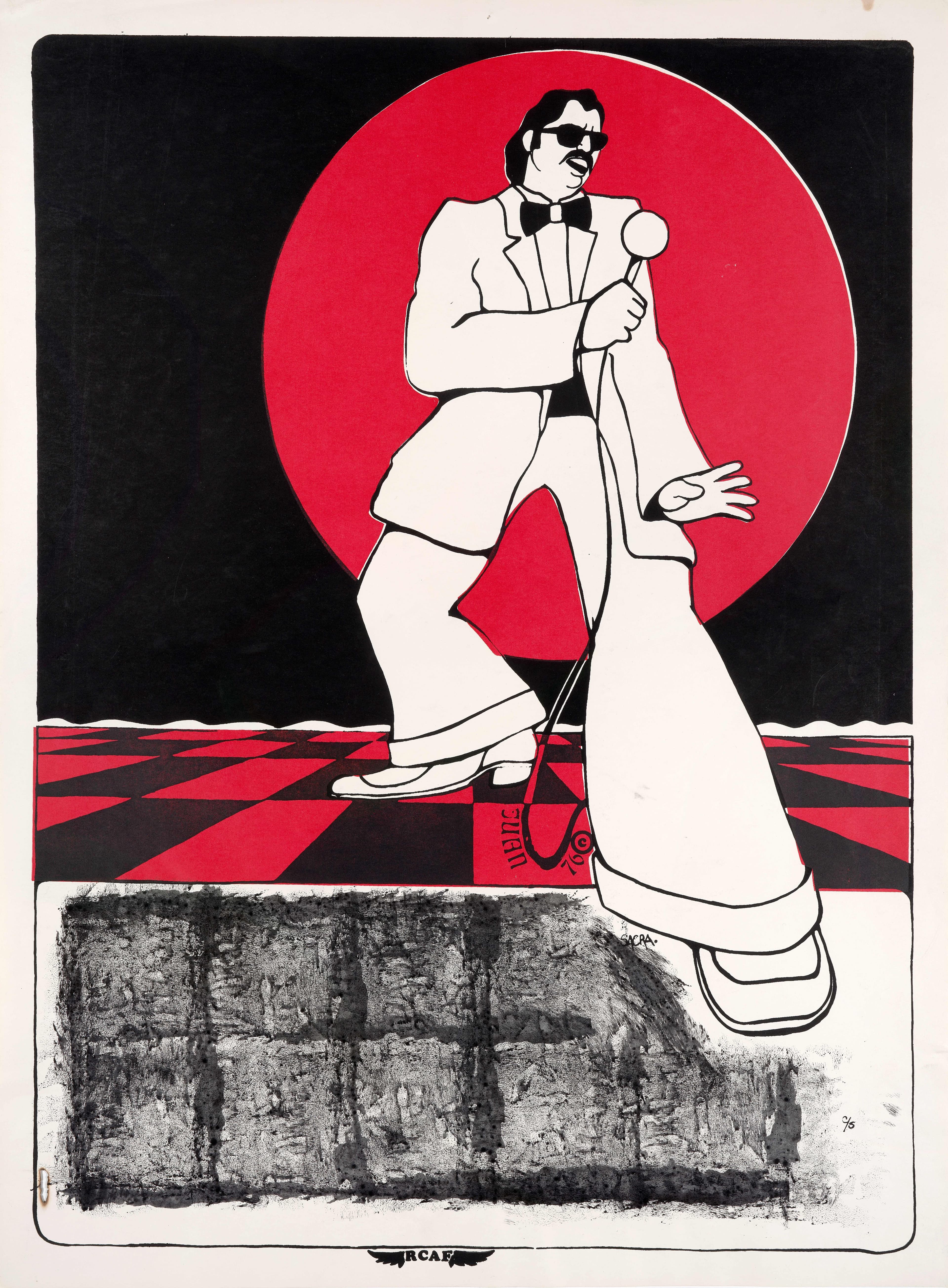 Five decades later, the RCAF’s graphics continue to resonate in their aesthetic innovations and foundational role within Chicana/o art history and American art. Operating in the public sphere, RCAF posters communicated with specific Mexican and Chicana/o audiences and educated others about Chicana/o artistic expression. As event announcements or political statements, each poster manifested bicultural choices and multivalent influences in the artists’ compositions, iconography, and screenprinting techniques. Imagery dominated the posters’ composition, with the text often relegated to a small area. This is apparent in Juan Cervantes’s poster The Singer (1976) [fig. 8]. Shown performing, the figure’s elongated front leg breaks the picture plane. Cervantes’s strategic use of bold red and black on white paper to delineate the figure also accentuates the sense of motion and drama, and his design could become an announcement poster by replacing the black tile bottom section and inserting text, underscoring the aesthetic foundation of the RCAF artists’ community-based production.