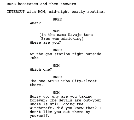 Before long, I hold the camera up to Melissa's face and yell, "Go." Our short film is about a young Navajo mother’s journey back to the reservation to see her daughter from the big city in the middle of winter. It is a mirror telling of my own parents living in Phoenix, Arizona and leaving me with my grandparents in my fragmented memory of the reservation. This messy tapestry of frustration and love, and having to be away from my mother and father, has disrupted my relationship to the Navajo language. Money was our priority, and it was Melissa’s character Bree’s as well. How monetary value is translated in Navajo for my characters is within their relation, or lack thereof, with the distance between each other. The wider the distance, the more money my protagonist can obtain. At least this was the argument from Bree’s mother. This was called, nízaadę́ę́’, or “far away.” According to Bree’s mother, money was “far away.” So when we refer to nízaadę́ę́’, we are truly talking about “money.”